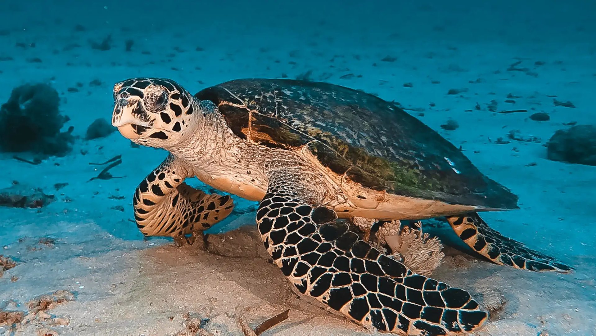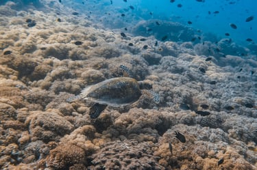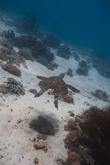 The reef stretches from 2 to 18 meters and is known for its many turtles, colorful reef fish, and vibrant hard coral formations. You can also spot cuttlefish, moray eels, and other marine life in the clear, warm waters – making this site a favorite for peaceful underwater exploration.