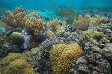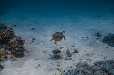The reef is densely covered in vibrant soft corals and teeming with life. Sea turtles are often spotted gliding through the shallows, while stingrays rest on the sandy bottom or pass silently by. The reef buzzes with activity, offering constant encounters with colorful reef life in every direction.