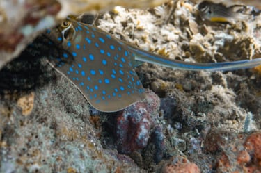 Turtles are regularly seen here, swimming gracefully or resting on the reef. Blue-spotted stingrays are common, and eagle rays sometimes glide by in the deeper parts. The reef is full of movement, with plenty of marine life to discover on every dive.